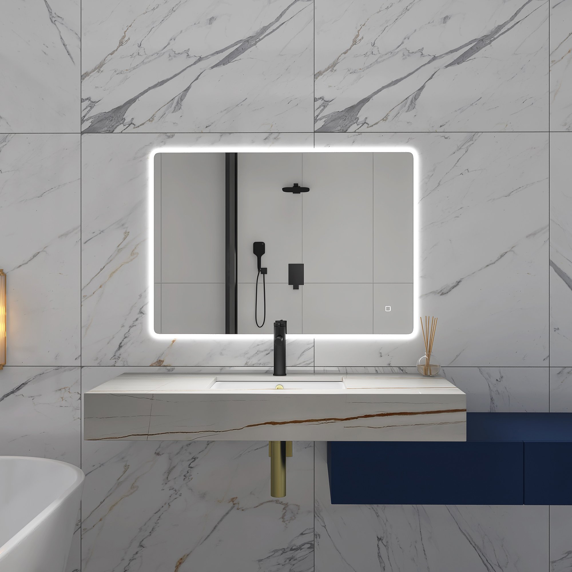 It's a good choice for your bathroom decoration and home improvement. This mirror was designed for the bathroom. The size and material were the best fit for bathroom use. The design matches the bathroom vanity which fits your bathroom decoration. This rectangular frameless bathroom vanity mirror with pretty led lighting builds a warm and cozy atmosphere. The soft light on your face through the mirror is perfect for makeup. The LED mirrors feature water-proof and moisture-proof backing; IP44 rated to ensure safe lighting in wet bathroom environments. Easy to use using the touch sensor with a transparent logo.