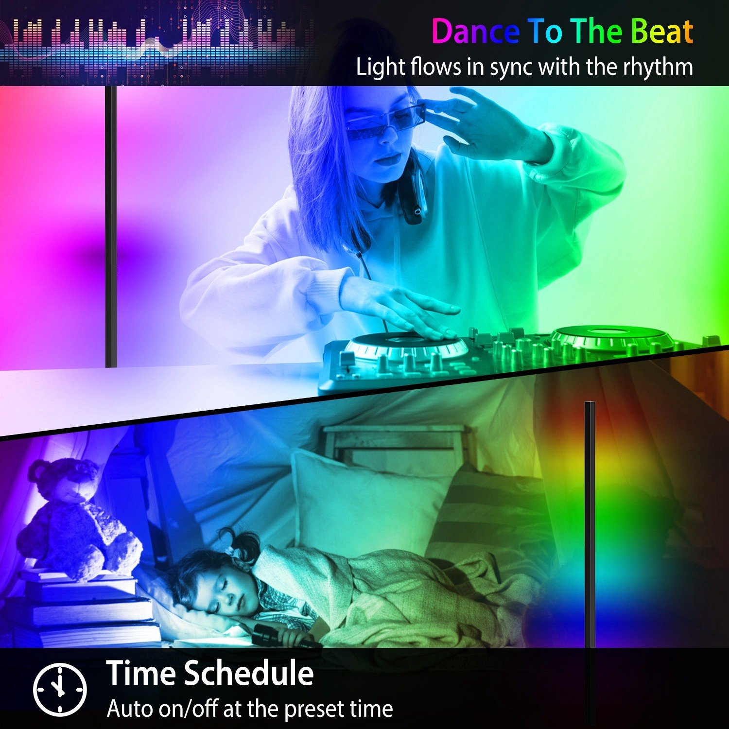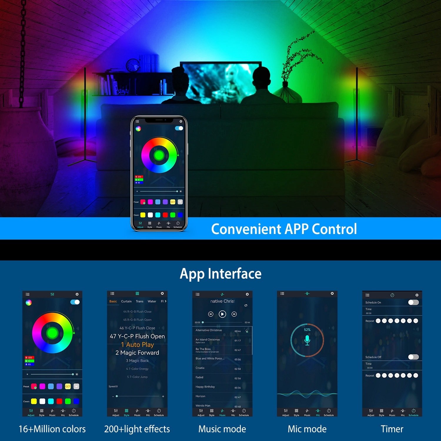*App And Remote Control*:You can adjust light effect via the remote or APP; without leaving couch or bed. This color changing floor lamp comes with 16 million colors and more than 200 preset lighting effects. You can freely switch it to fit various scenes. If you are not satisfied with any of them; customize the color sequence; speed; and brightness yourself.