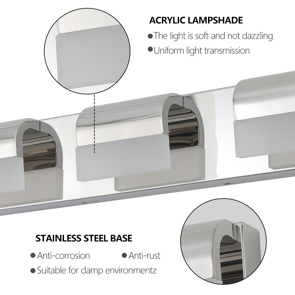Chrome Modern Bathroom Vanity Lighting 3-Light LED Vanity Lights Over Mirror Bath Wall Lighting*STYLISH AND SIMPLE DESIGN: This chrome bathroom light fixtures has a stainless steel mirror base, acrylic shade and a built-in LED that emits a translucent, bright but not harsh light. *QUICK AND EASY INSTALLATION: This bathroom fixture is very easy to install, all mounting accessories are included in the package, just connect the wires and you can choose to install it up or down according to your preference. The modern vanity light makes your life instantly brighter.