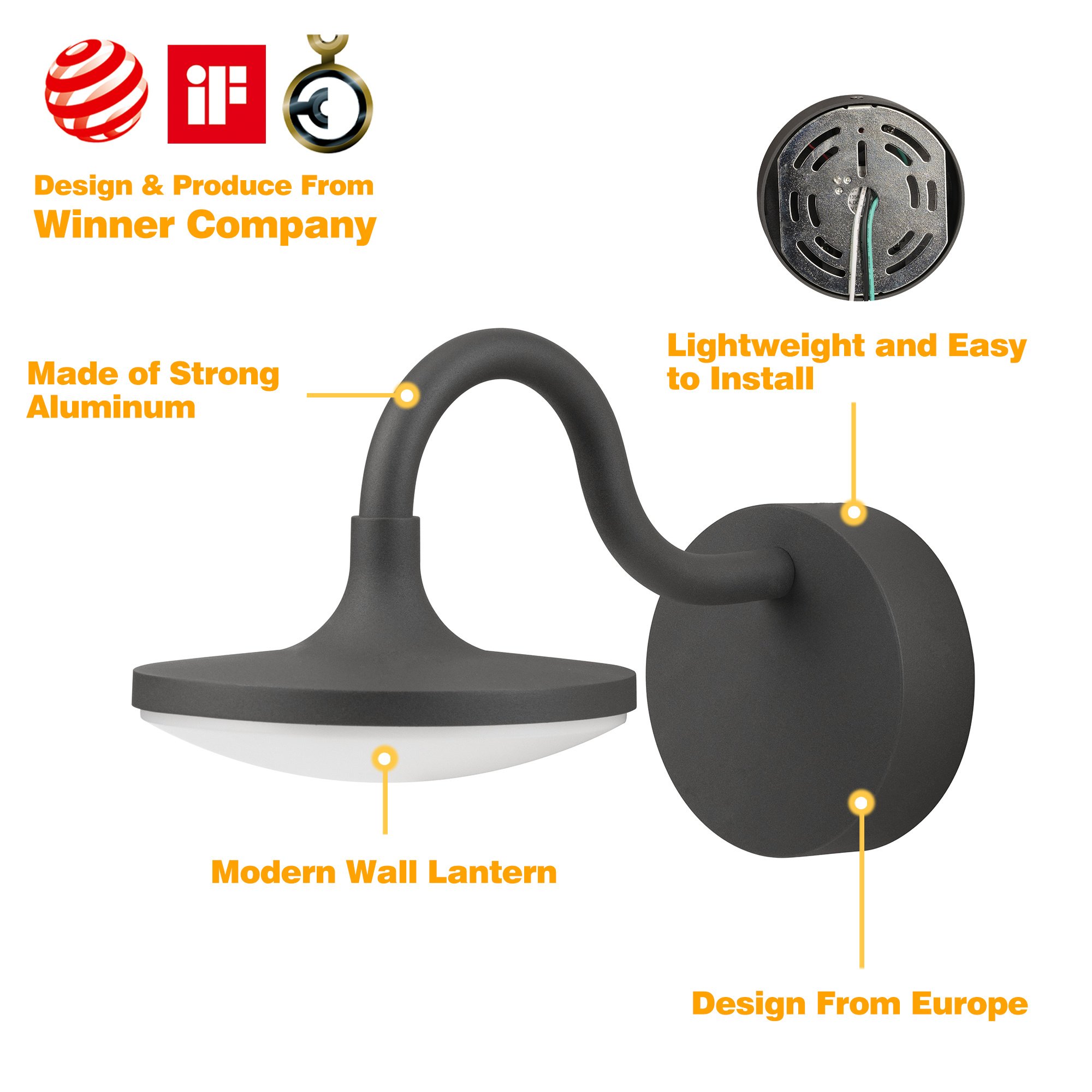 Good design; good material; good craftsmanship: Our elegant and classic design outdoor lights from well-known European designers. Many of our exterior lighting have won the Red Dot; German Design; IF Design Award many times. Constructed of 100% heavy-duty rugged die-casting aluminum; this LED wall sconce is shock; making it has a long lifespan of rated over 50 000 hours of use more durable.