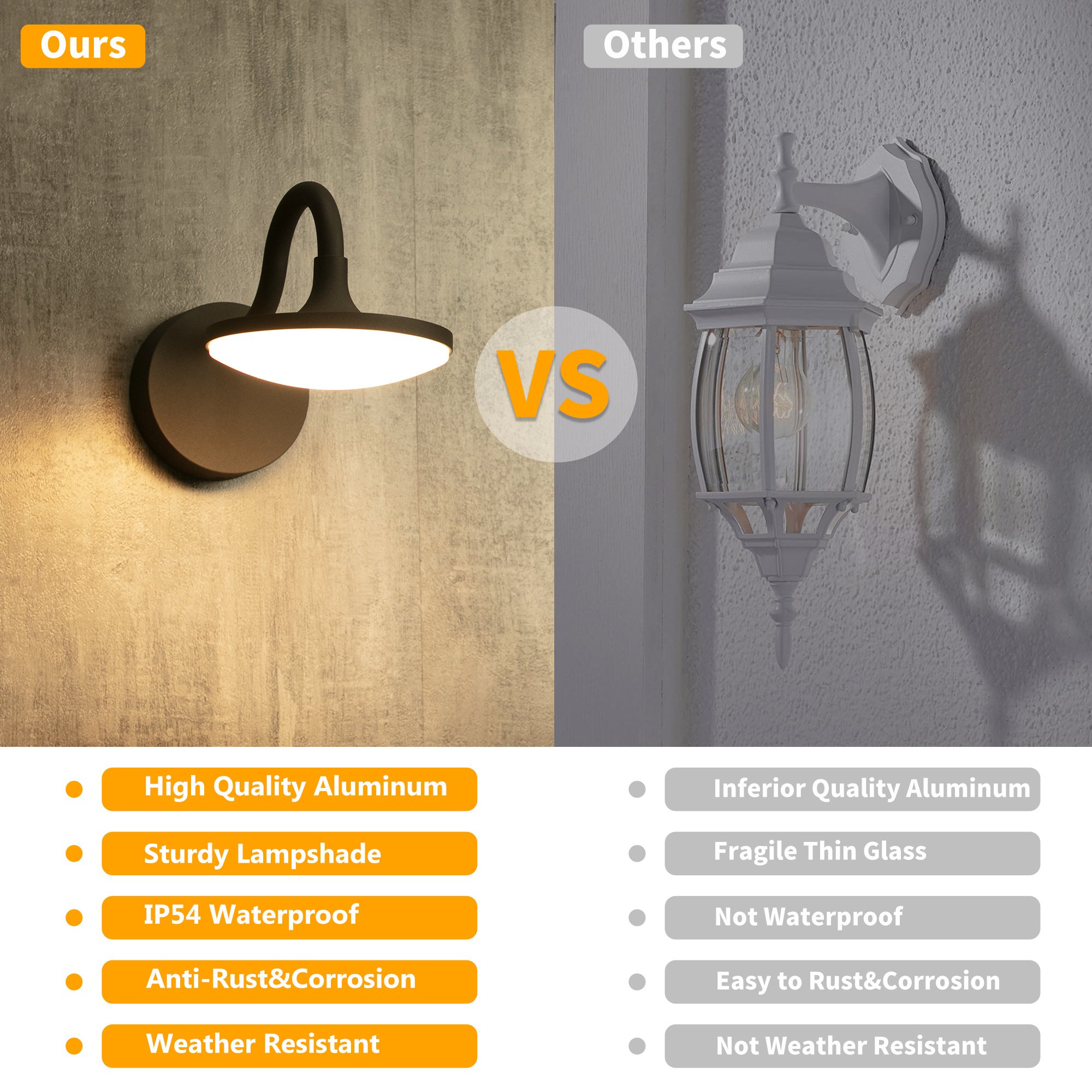 3.Waterproof & weather resistant: IP54 with quality aluminum. This outdoor wall sconces made of high quality aluminum. External lamp is anti-rust & corrosion. Suitable for heavy rain, cloudy, sleet, snowy, scorching sun, light fixture will still perfect after years of using.